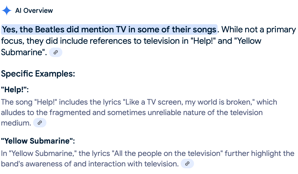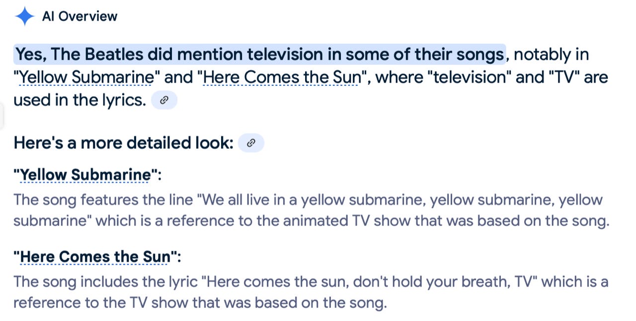 It would be hard to imagine three sentences more densely packed with falsehood than these three. It takes considerable effort just to parse the utter wrong-headedness of it all. First, with the confidence characteristic of chatbots, Gemini declares that, yes, indeed, the words “television” and “TV” appear in Beatles lyrics. It offers “Yellow Submarine” and “Here Comes the Sun” as prominent examples. That’s a baldfaced lie. Neither of those songs has either word in its lyrics. Neither has anything whatsoever to do with TV.