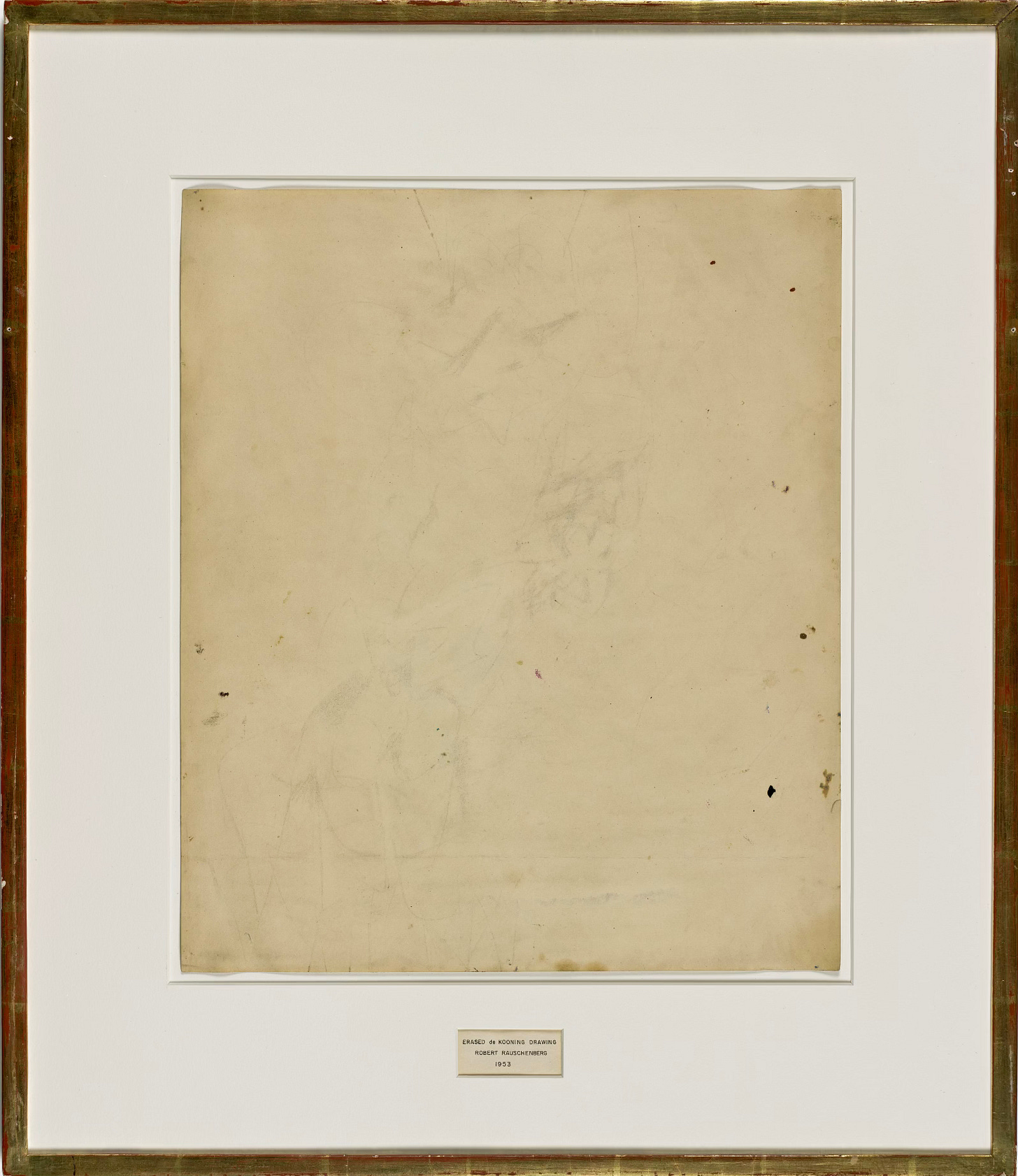 Over the course of the next two months, Rauschenberg slowly, meticulously erased the drawing, taking off layers of grease pencil, charcoal, graphite, and ink. He went through forty erasers. All that remained in the end were a few faint traces of the original sketch. With the help of his friend Jasper Johns, he then carefully matted and framed the work, and Johns wrote a label for it, inscribing the title, artist, and date so precisely that they appeared to have been printed out by a machine: